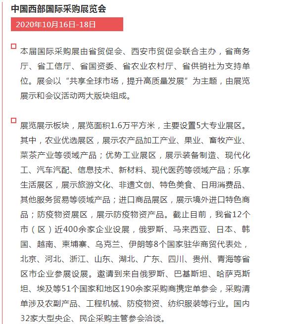 中國西部國際采購展覽會(huì)(以下簡稱“國際采購展”),于2020年10月16日-18日在西安國際會(huì)展中心展覽館1號(hào)展廳舉行。本屆國際采購展以“共享全球市場(chǎng),提升高質(zhì)量發(fā)展”為主題,深度融入共建“一帶一路”,助力陜西打造內(nèi)陸改革開放高地,落實(shí)好穩(wěn)外資、穩(wěn)外貿(mào)的要求,更好服務(wù)疫情常態(tài)化形勢(shì)下企業(yè)開拓國際市場(chǎng)。我公司受西安貿(mào)促會(huì)邀請(qǐng)參加本次展覽會(huì)。